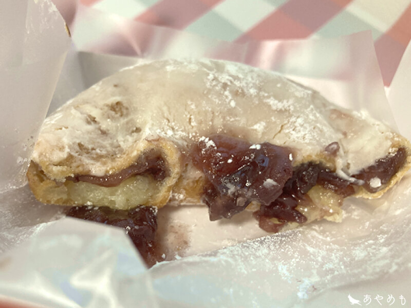 口に入れると厚いシュガーの層がホロホロと溶けていき、やわらかくもちもちしたドーナツと甘さ控えめの粒あんに染みて、甘さがじんわり広がります。