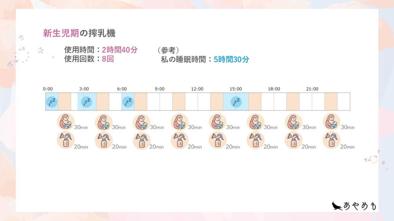 搾乳機の1日の使用時間は2時間40分、回数は8回ほどです。
