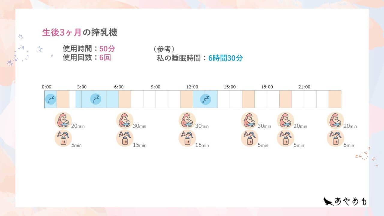 生後3ヶ月頃、搾乳機の1日の使用時間は50分、回数は6回ほどです。